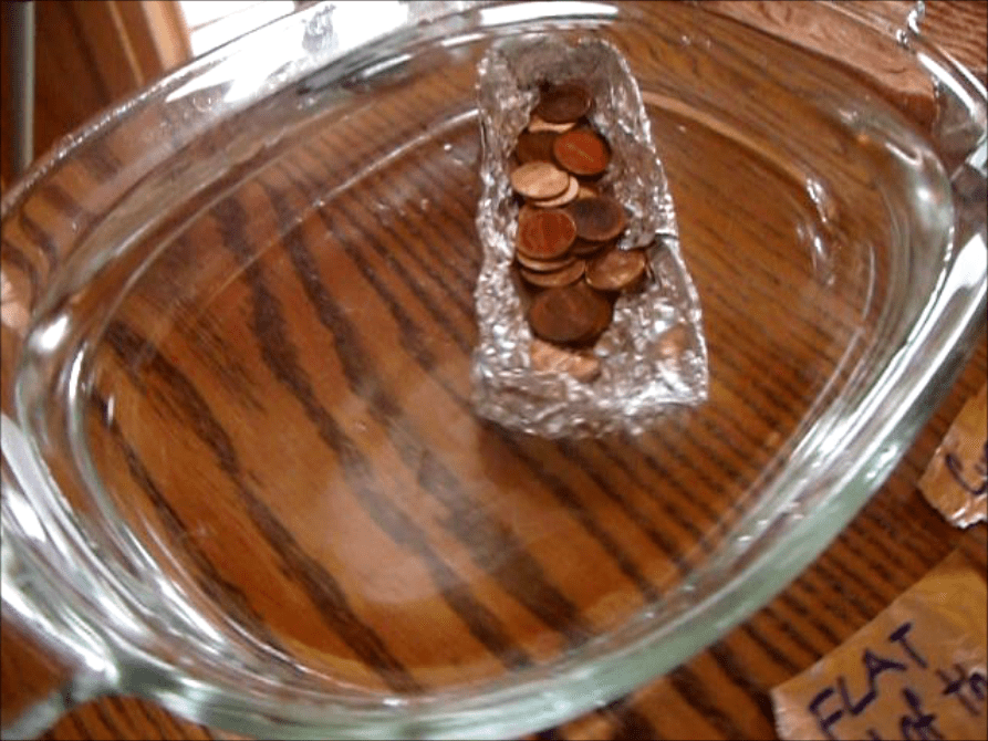 Experiment I used three different types of boat. A flat one similar to a raft, a rounded one like a bowl, and a boat with a deep pocket. I took turns putting each boat, made out of foil, and slowly added more pennies to it, until it sank.